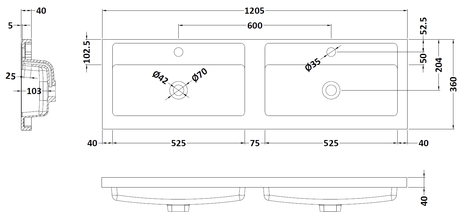 Fusion 2 Tap Hole Double Polymarble Basin 1200mm
