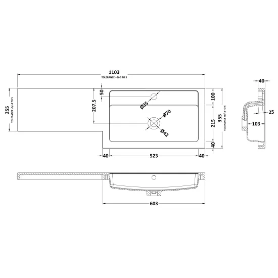 Fusion Right Hand Square L-Shaped 1 Tap Hole Polymarble Basin 1100mm