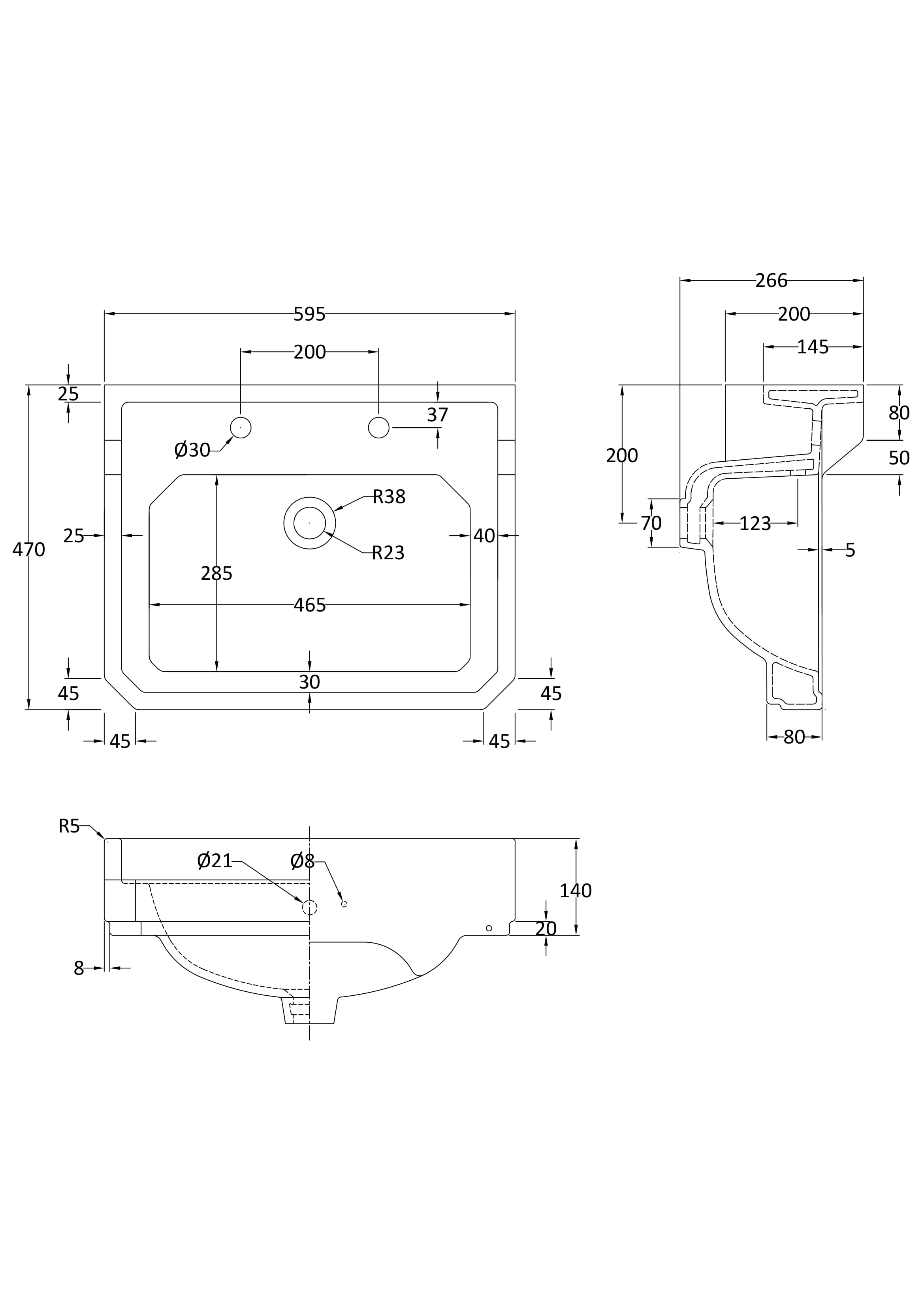 Richmond Wall Hung 2 Tap Hole Basin 595mm