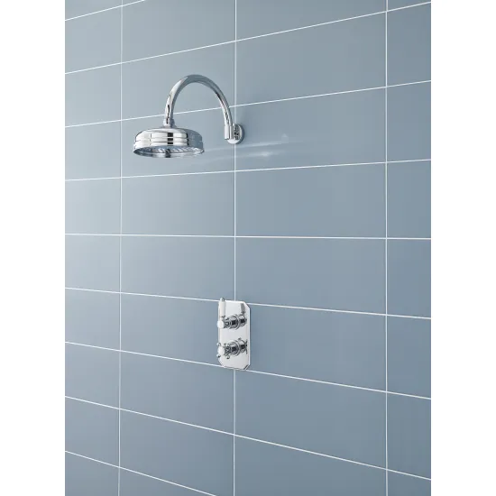 A stunning classic finishing touch to your shower. 8 inch Apron fixed head design. Manufactured from solid brass with a luxury chrome finish.