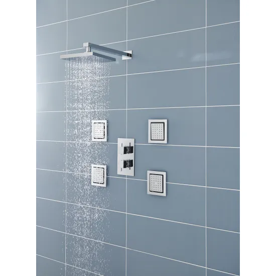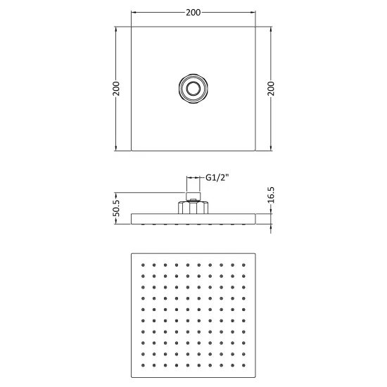 Square minimalist design. Suitable for wall mounted or ceiling arms. 1/2" BSP swivel connector. Suitable for low pressure.
