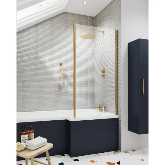 Utilise space in your bathroom and create a showering space within your bath. Every bath screen is reversible in order to perfectly fit your needs. This screen is made of 6mm toughened safety glass. Stunning contemporary brushed brass profile.