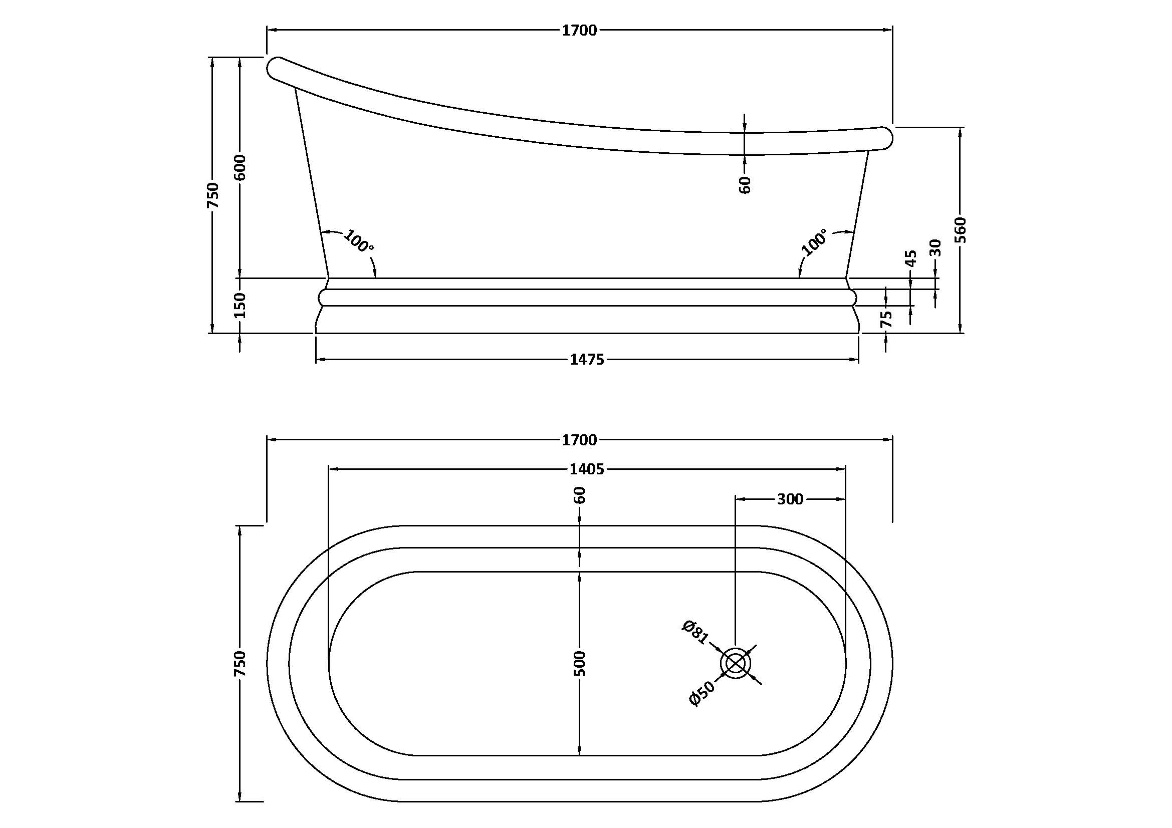 1700mm Slipper Bath - Copper Outer/Nickel Inner