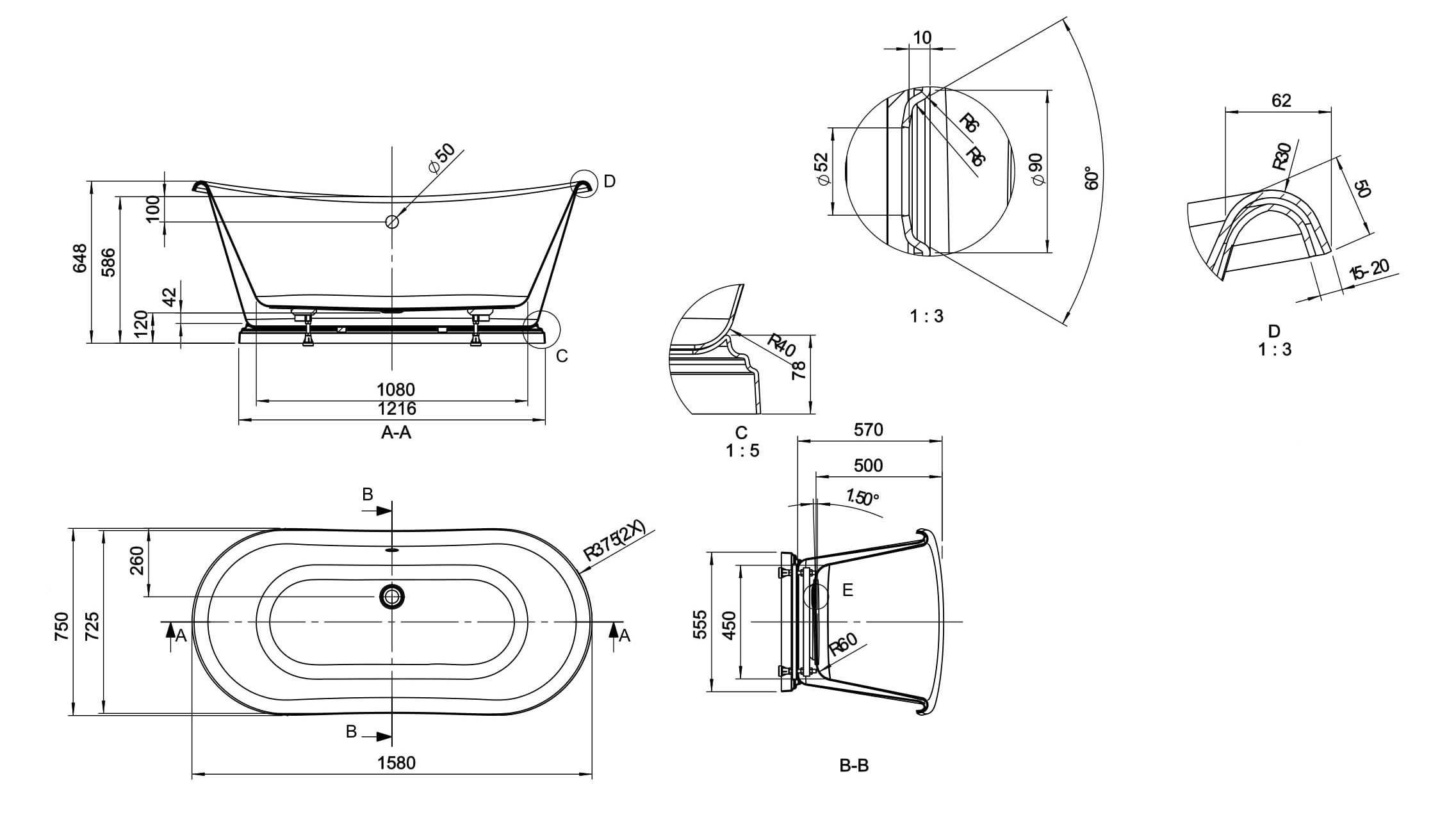 Boat Freestanding Double Ended Acrylic Boat Bath - 1580mm