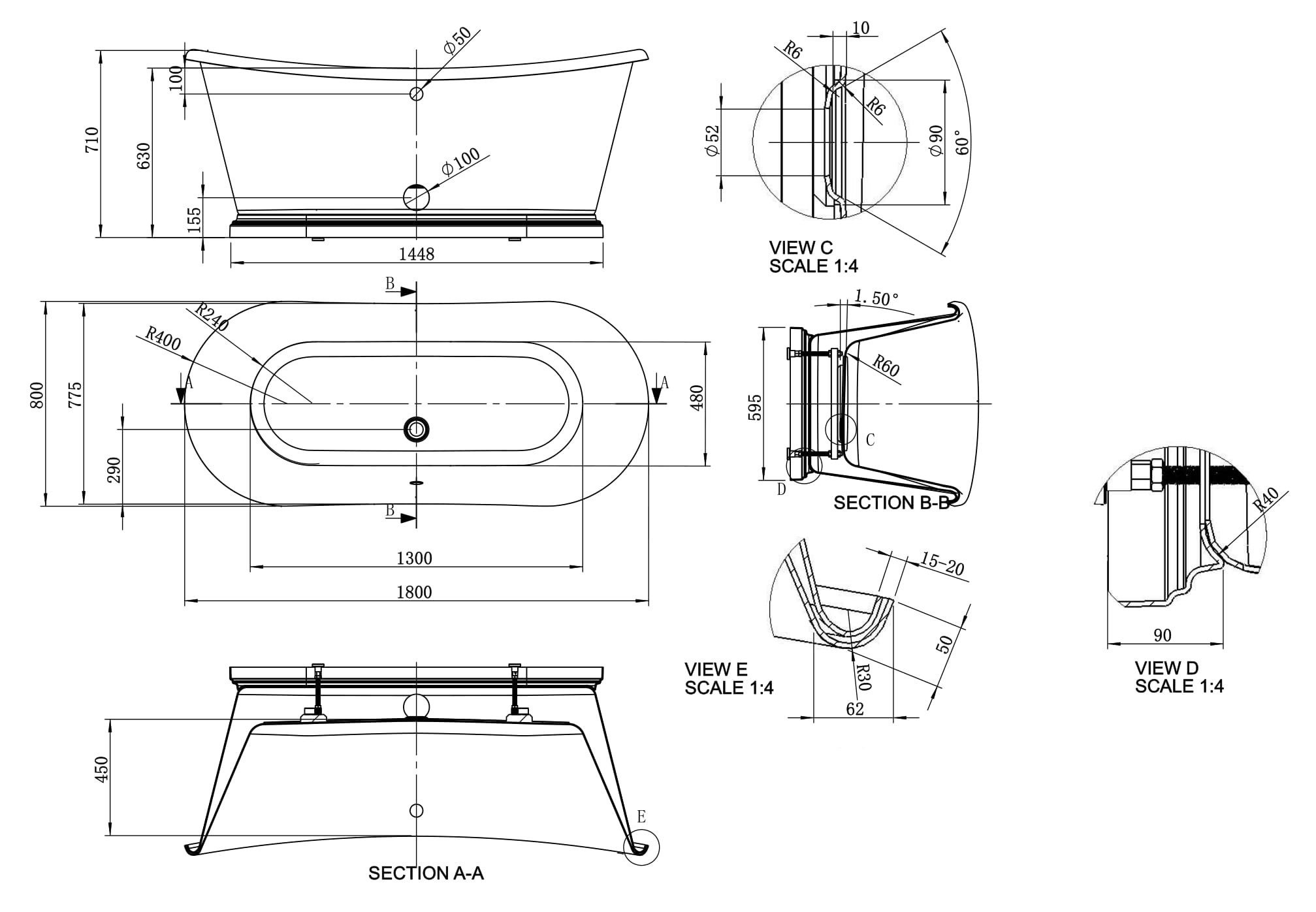 Boat Freestanding Double Ended Acrylic Boat Bath - 1800mm