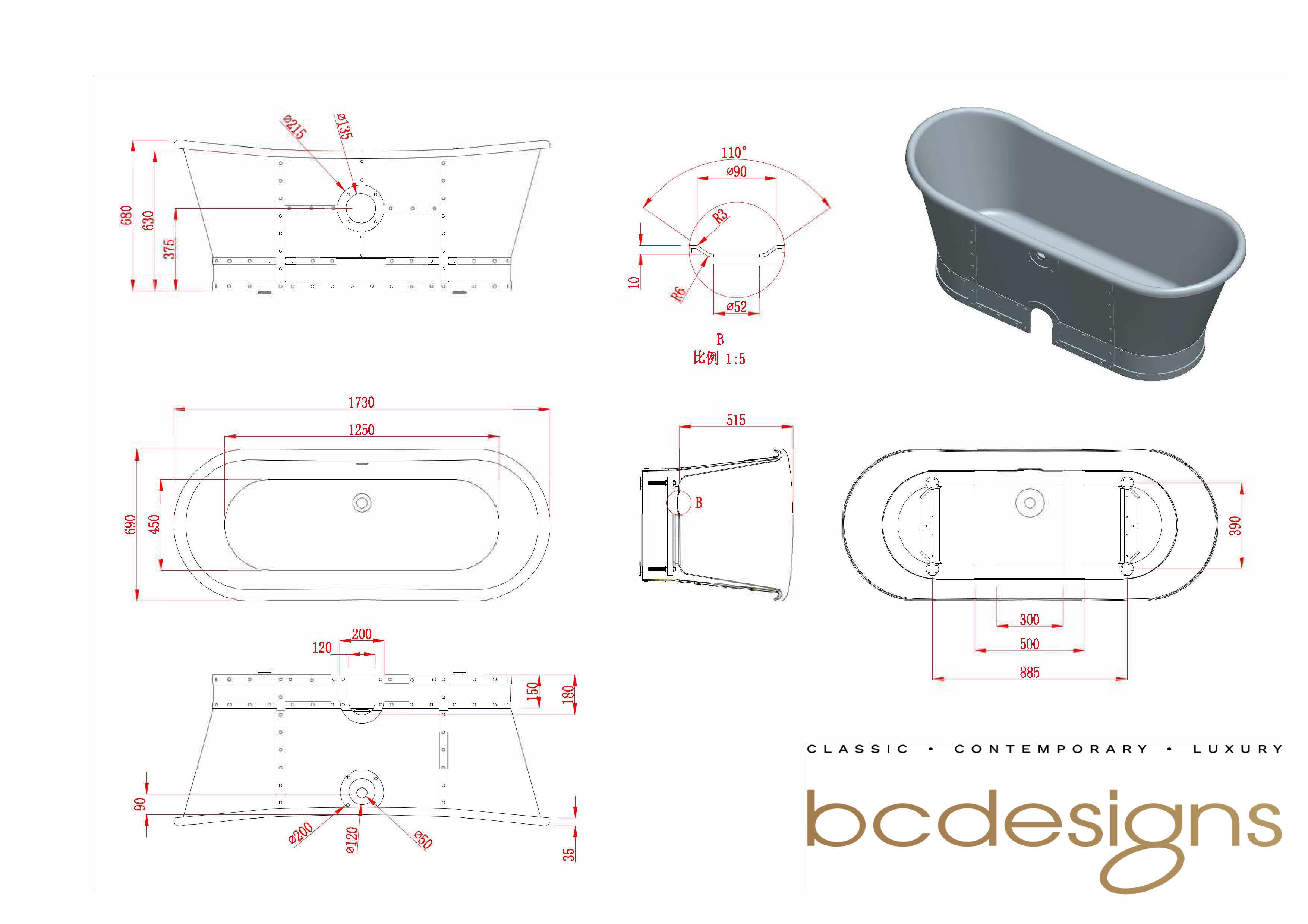 BC Designs Industrial Freestanding Industrial Boat Bath - 1710mm - Grey
