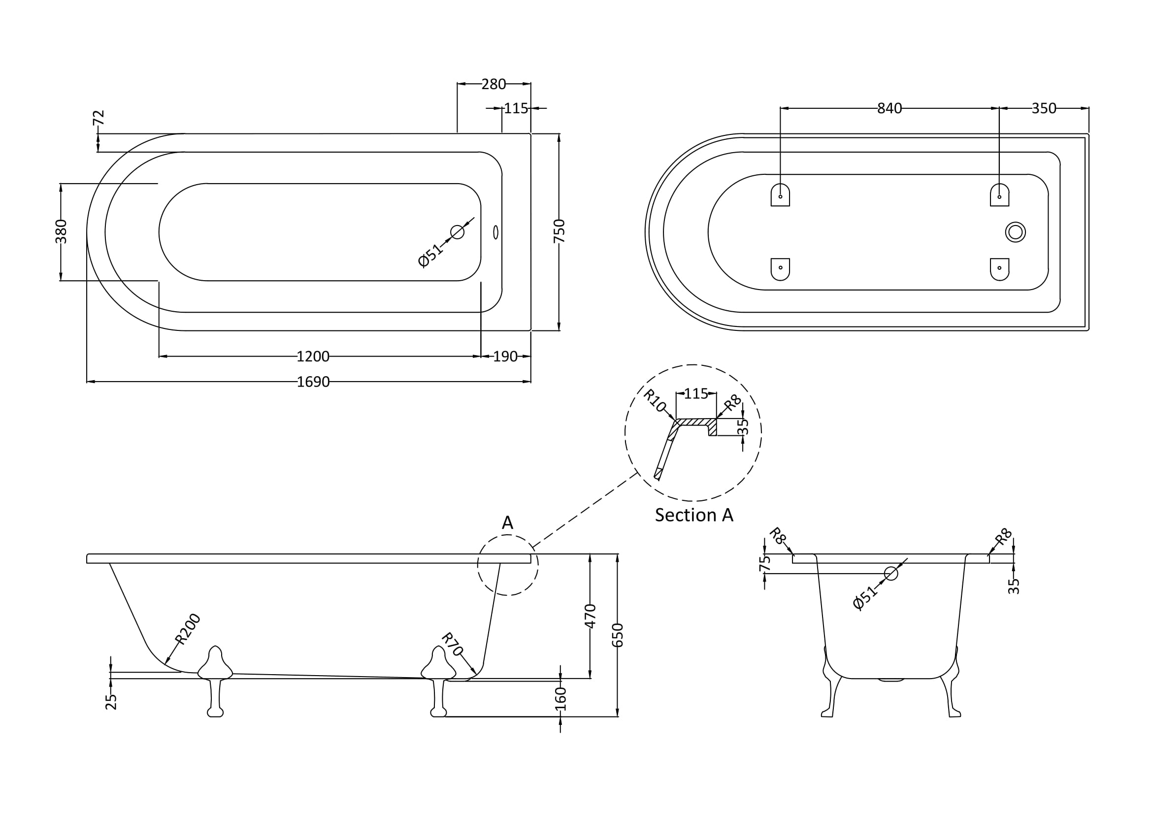 Single Ended Freestanding Shower Bath - Corbel Leg Set 1700mm
