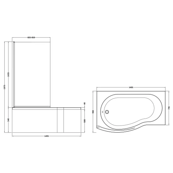 nuie Shower Baths 1500mm B Shaped Left Hand Bath Set