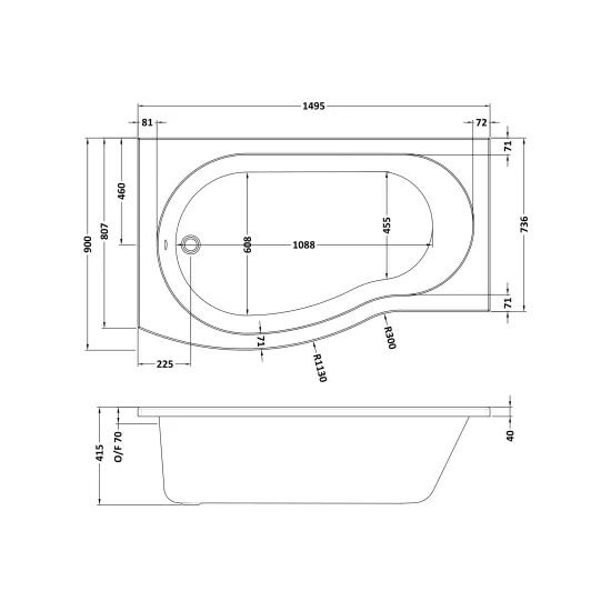 nuie Shower Baths B-Shaped Shower Sath Left Hand 1500mm - No Leg Set