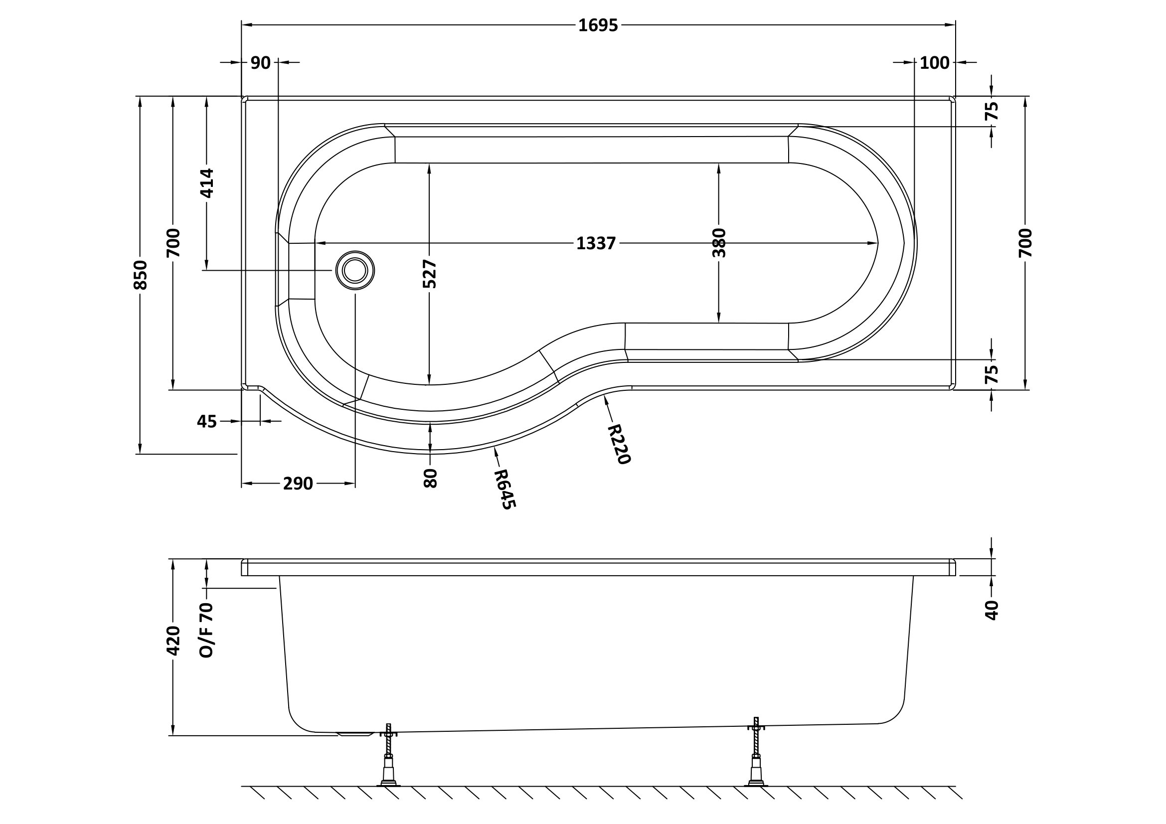 nuie Shower Baths 1700mm Left Hand P-Shaped Bath
