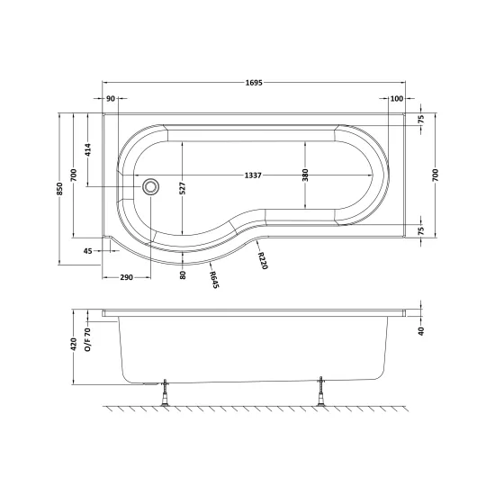 1700mm Right Hand P-Shaped Bath