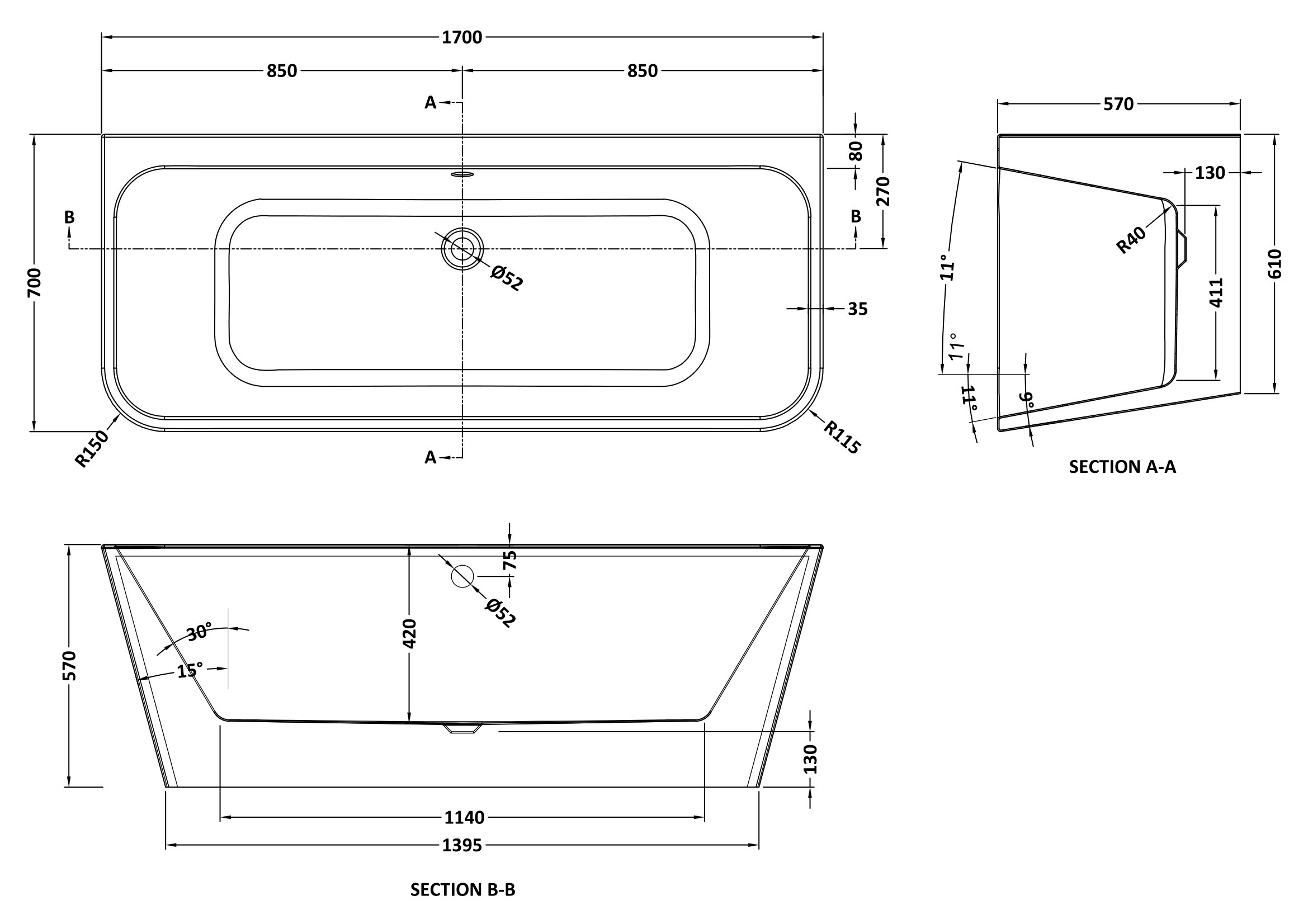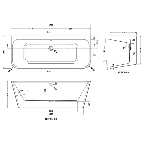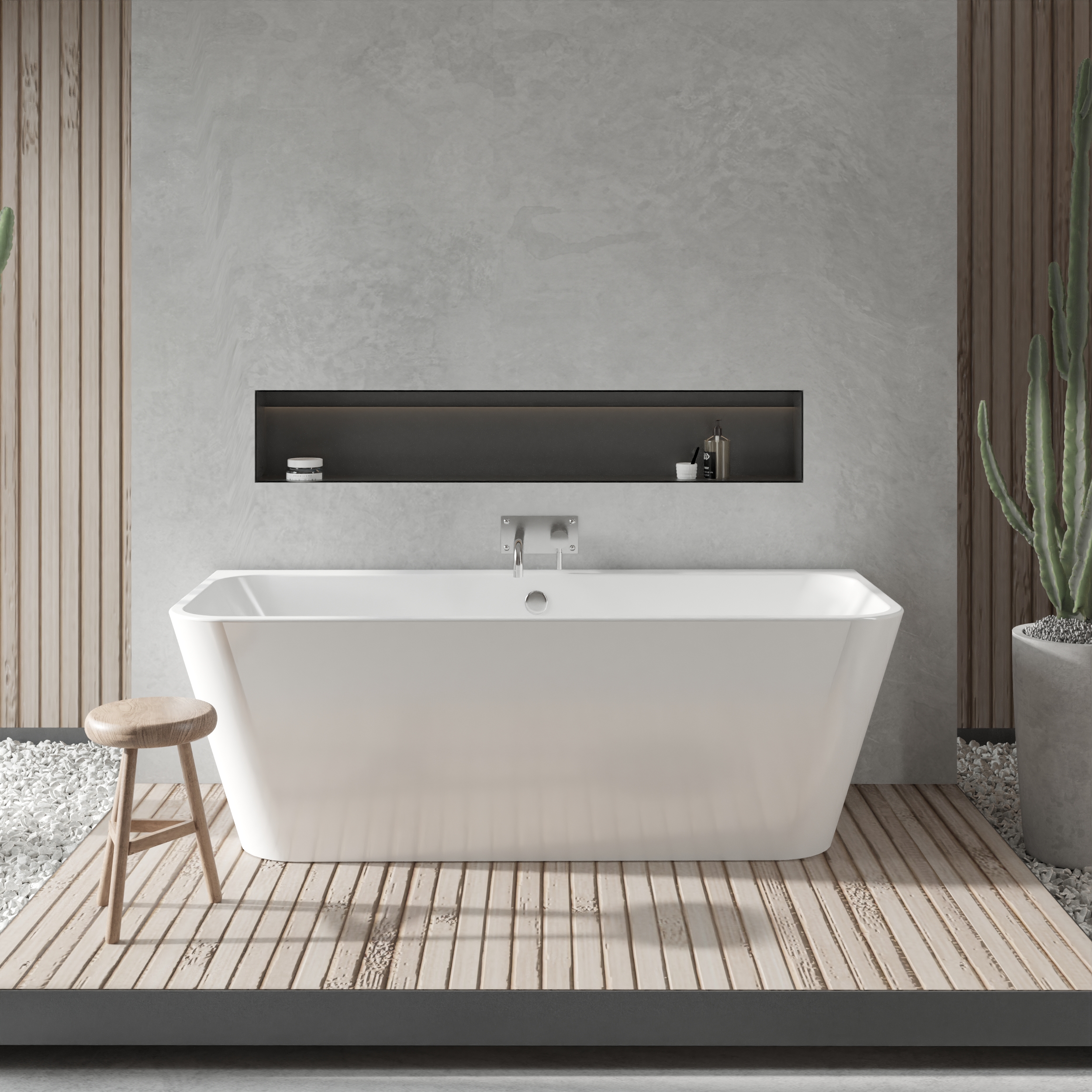 Soft Square Back to Wall Double Ended Bath Tub, 1700mm x 700mm