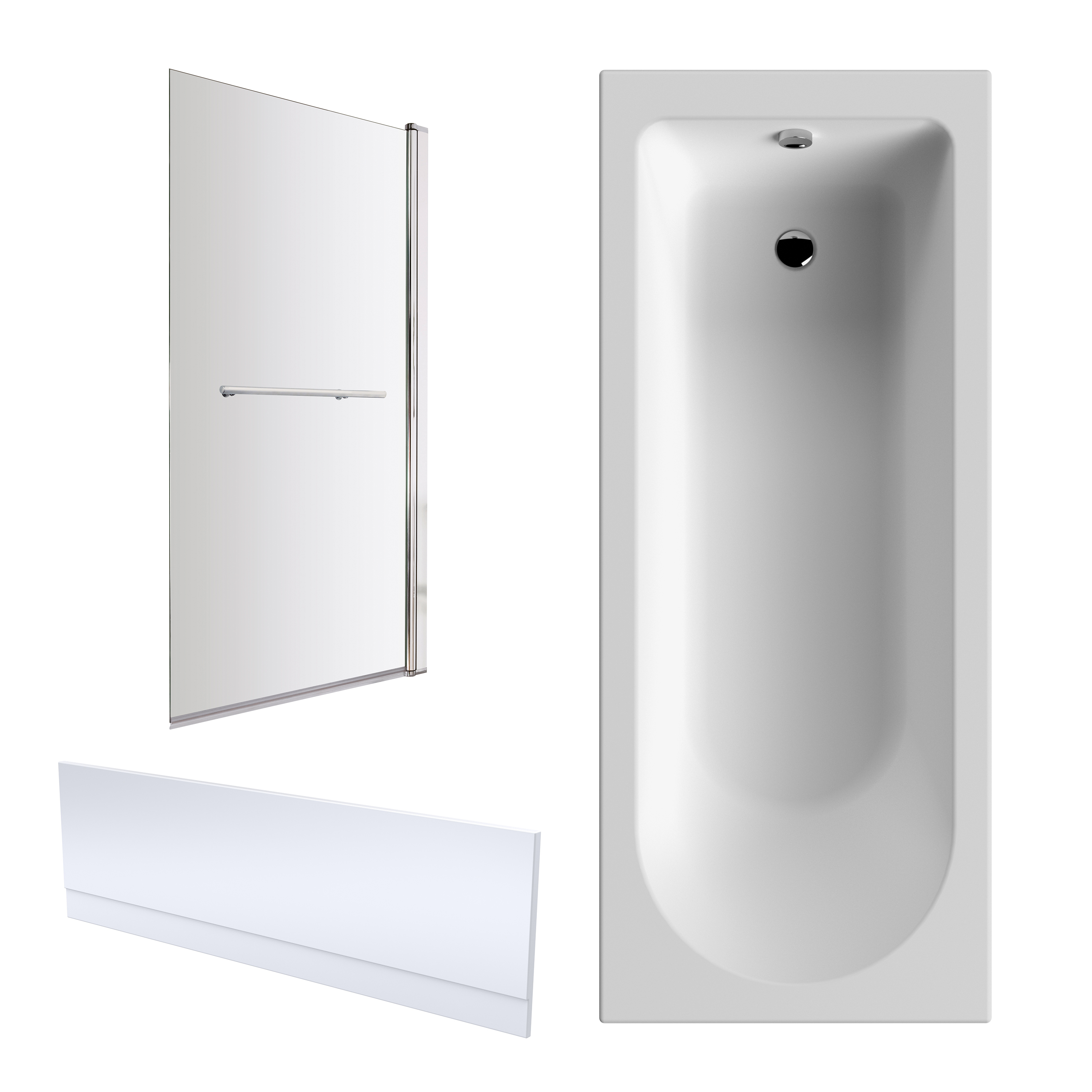 Round single ended bath, bath screen & gloss white acrylic side panel