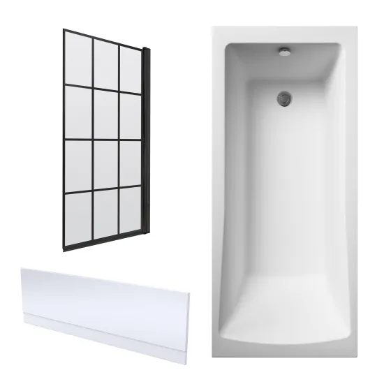 Square single ended bath, bath screen & gloss white acrylic side panel