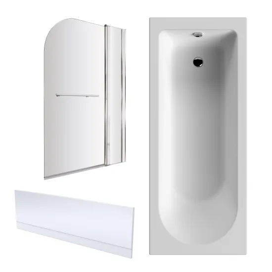 Round single ended bath, bath screen & gloss white acrylic side panel