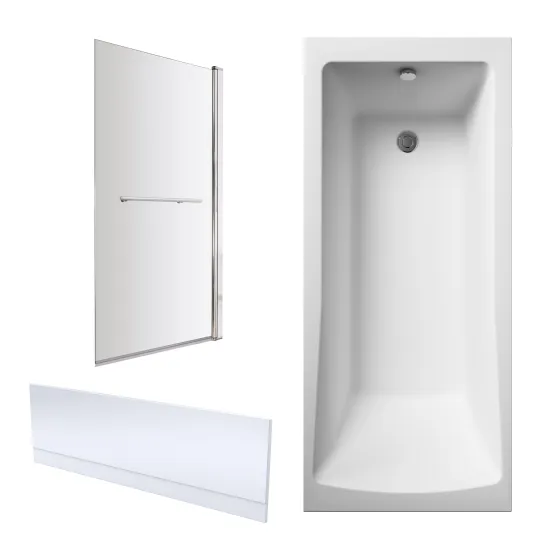 Square single ended bath, bath screen & gloss white acrylic side panel