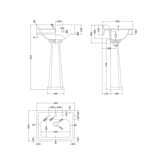 Old London Richmond 560mm 3 Tap Hole Basin & Comfort Height Pedestal