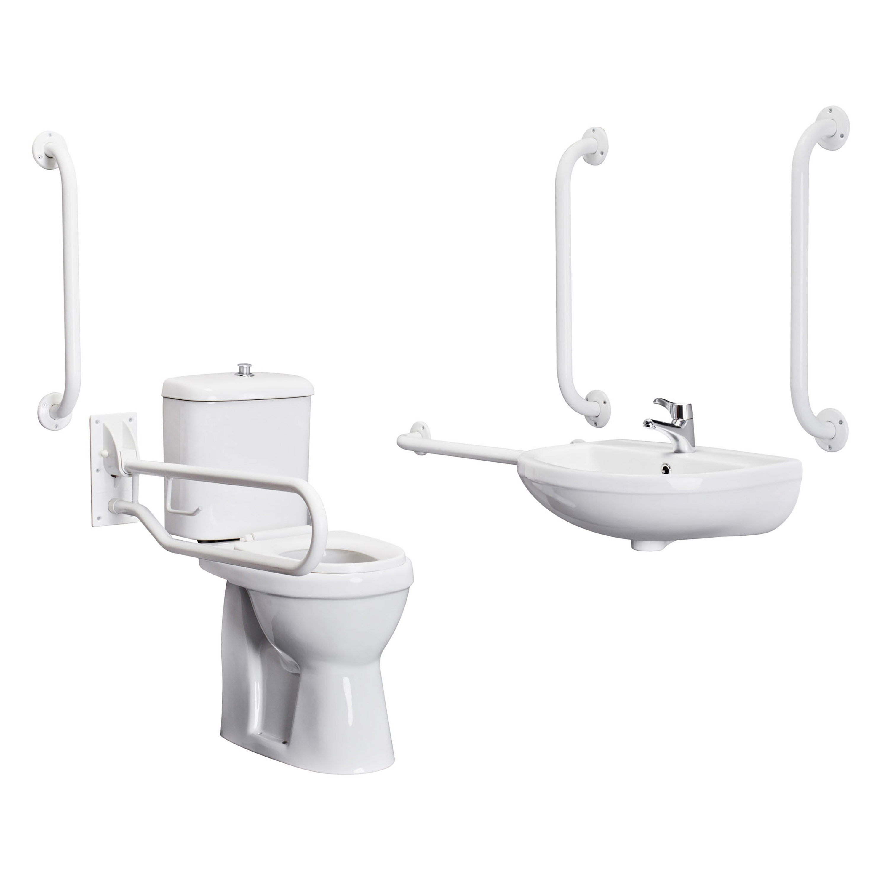 Includes; Comfort Height Doc M Pan, Doc M Cistern, Toilet Seat, Wall Mounted Basin, 5 Grab Rails (5th rail to be fitted to the back of the door), 1 Drop-down Rail & Spray Mixer Tap. Mirror & bottle trap not included.