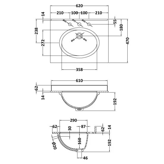600mm Single Bowl Marble Top - 3 Tap Hole