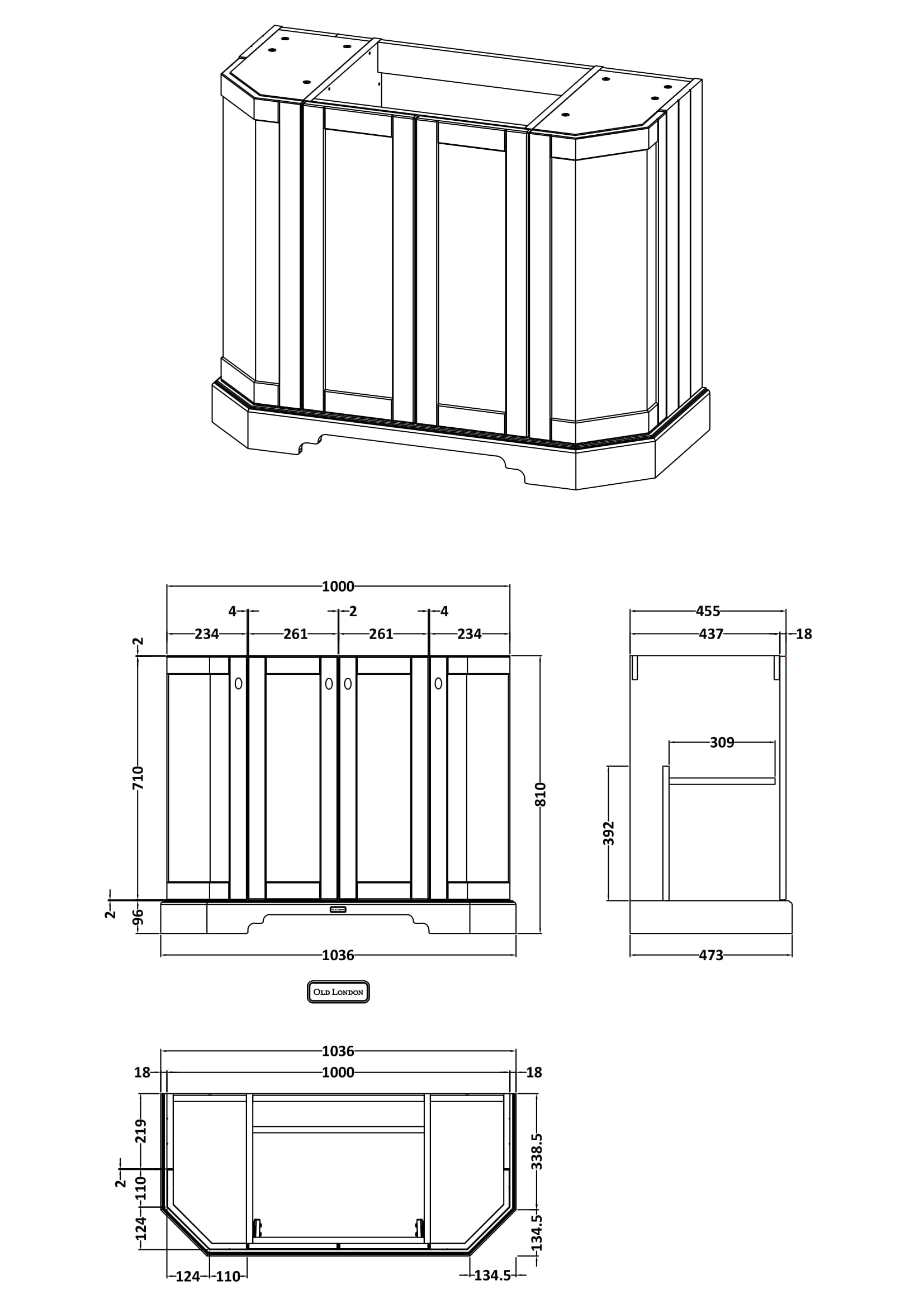 Old London Floor Standing Angled 4 Door Basin Unit 1000mm - Twilight Blue