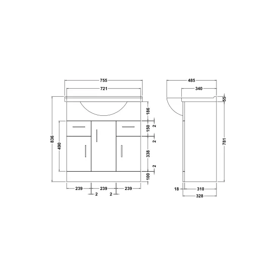 Mayford Floor Standing 3 Door 2 Drawer Vanity Unit 750mm