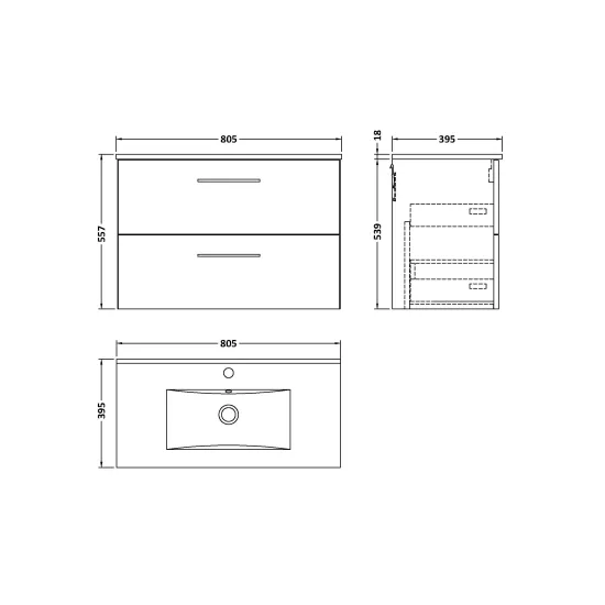 Arno Wall Hung 2 Drawer Vanity & Minimalist Ceramic Basin, 800mm