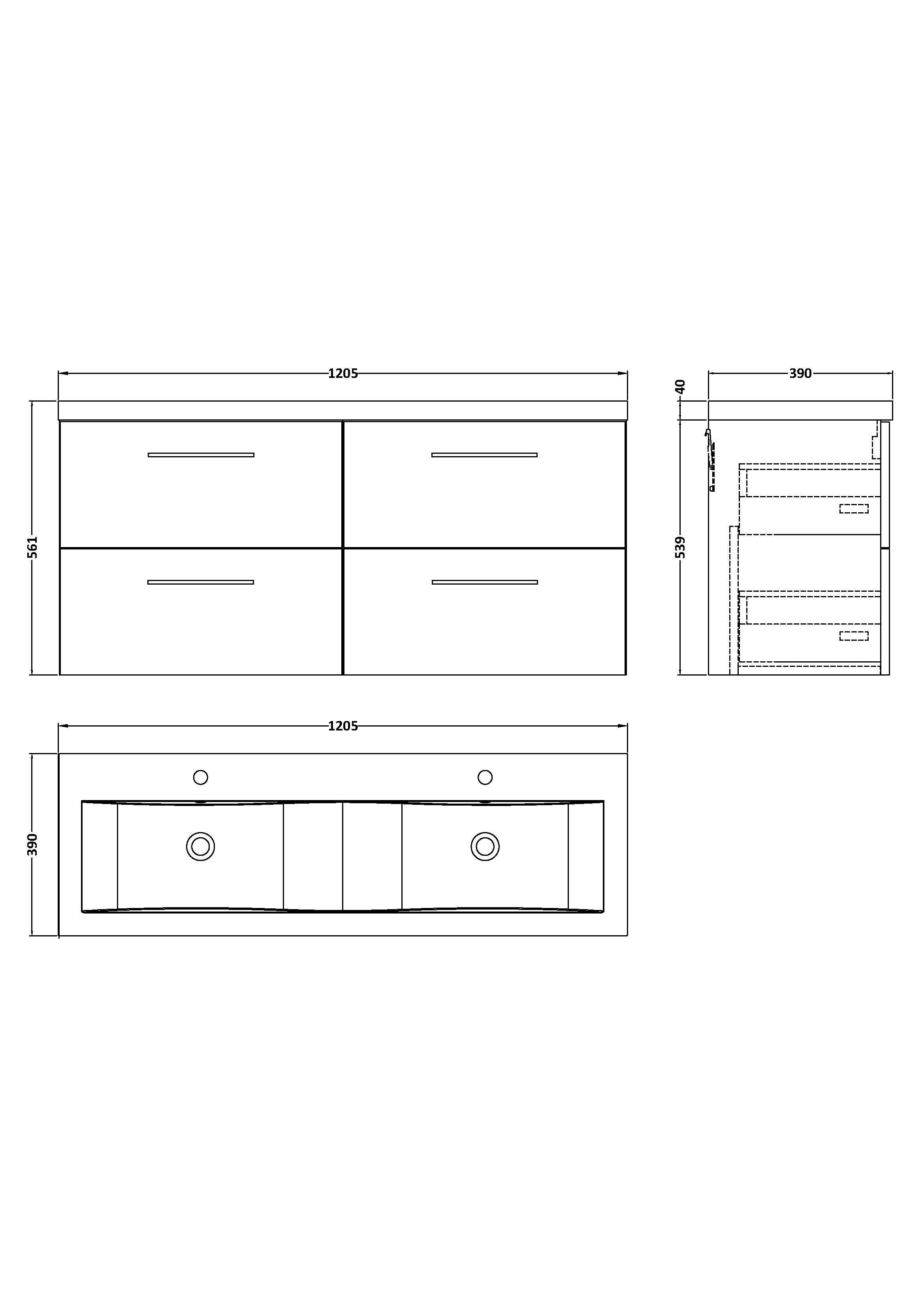Arno Wall Hung 4 Drawer Vanity & Double Ceramic Basin, 1200mm