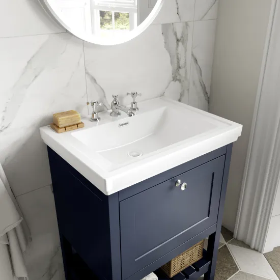 Hudson Reed Bexley Floor Standing 2 Door 1 Shelf Vanity & 3 Tap Hole Fireclay Basin, 800mm - Indigo Blue