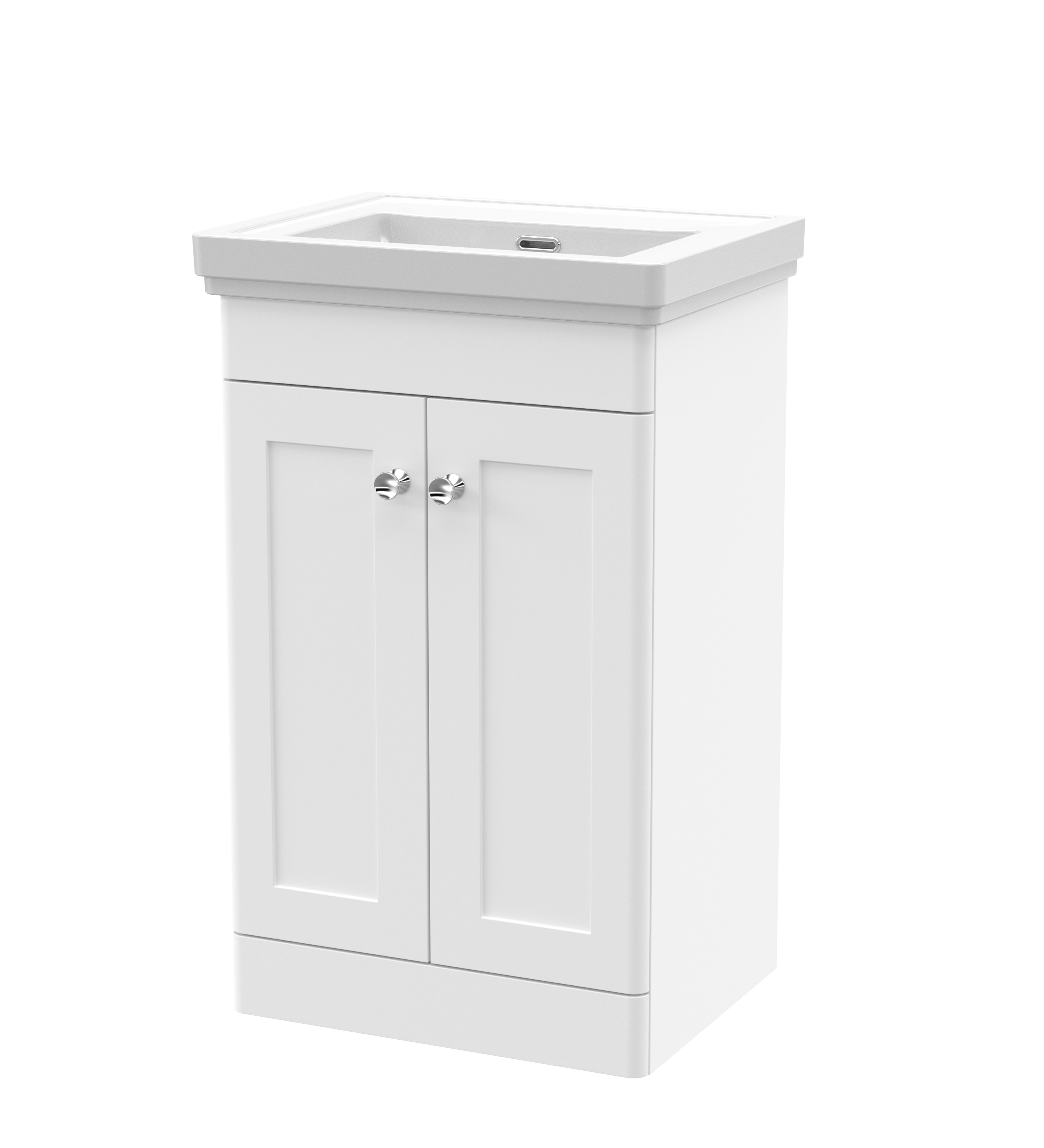 nuie Classique Floor Standing 2 Door Unit & 0 Tap Hole Fireclay Basin, 500mm - Satin White