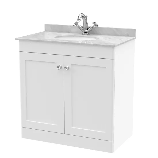 nuie Classique Floor Standing 2 Door Unit & 1 Tap Hole Marble Top with Oval Basin, 800mm - Satin White/Grey