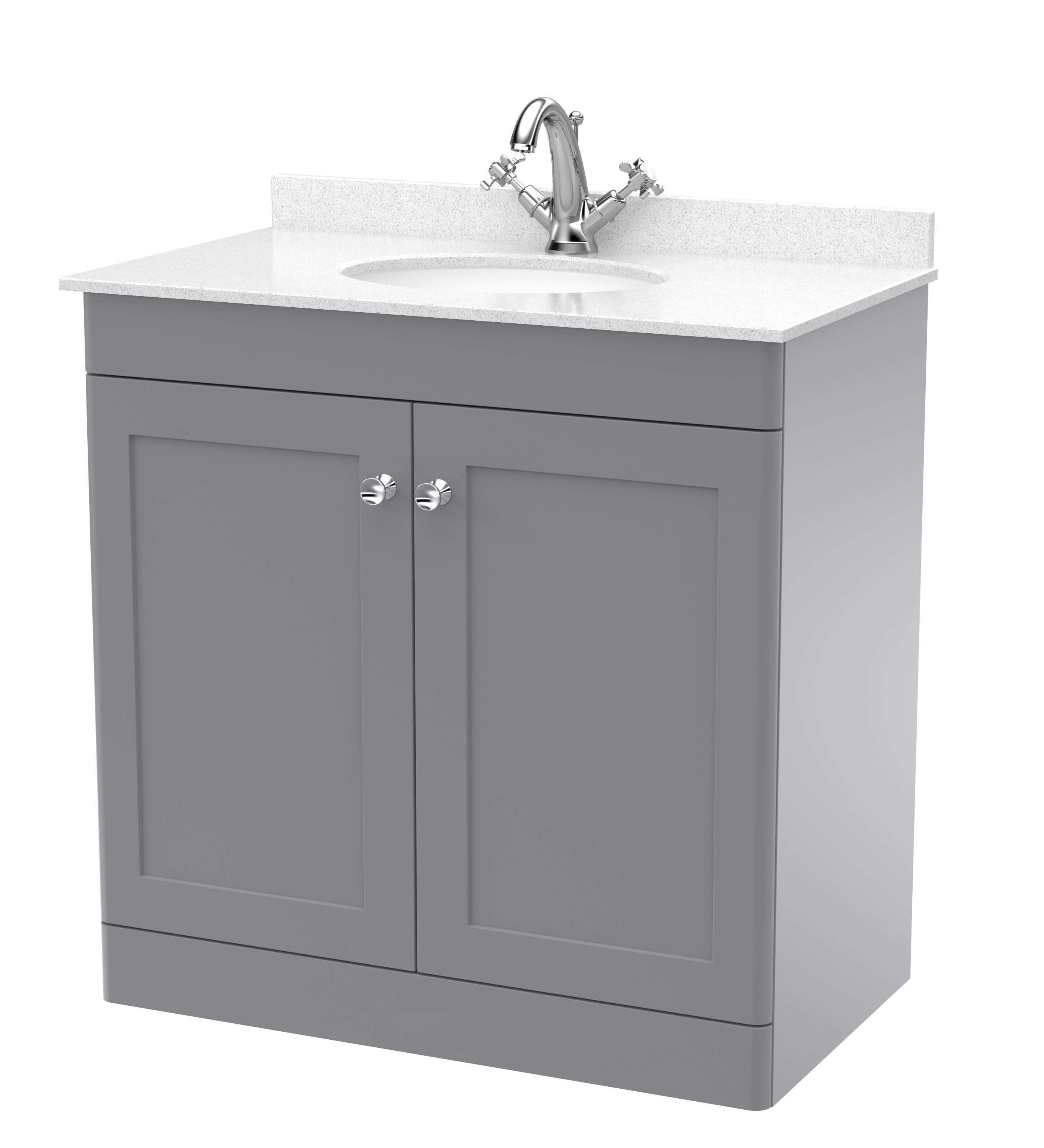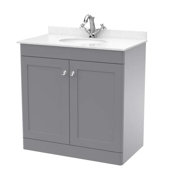 nuie Classique Floor Standing 2 Door Unit & 1 Tap Hole Marble Top with Oval Basin, 800mm - Satin Grey/White