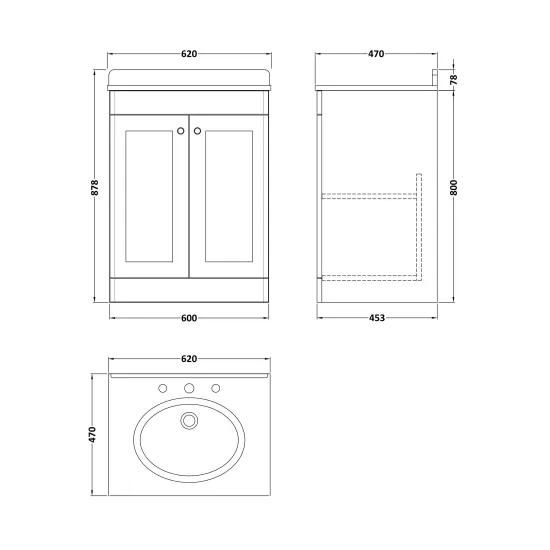 Classique Floor Standing 2 Door Unit & 3 Tap Hole Marble Top with Oval Basin, 600mm