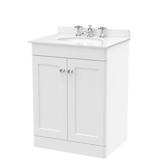 nuie Classique Floor Standing 2 Door Unit & 3 Tap Hole Marble Top with Oval Basin, 600mm - Satin White/White