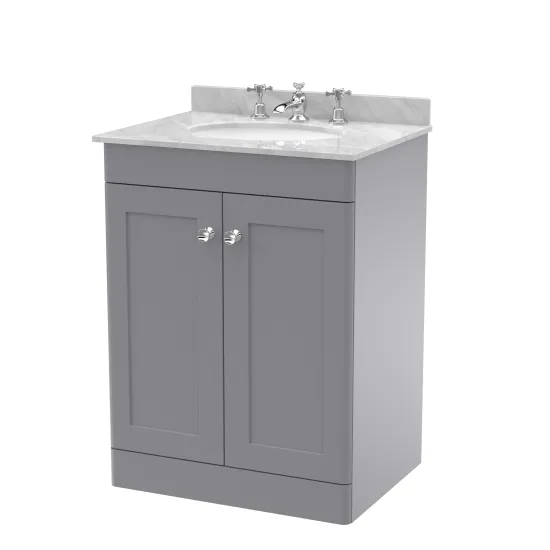 nuie Classique Floor Standing 2 Door Unit & 3 Tap Hole Marble Top with Oval Basin, 600mm - Satin Grey/Grey