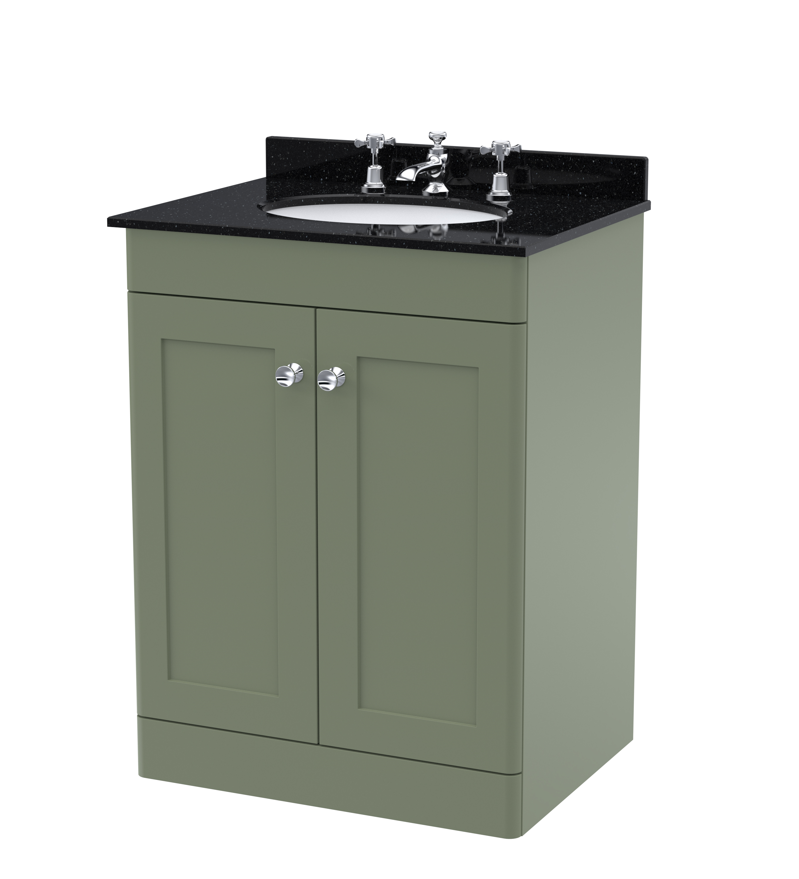 nuie Classique Floor Standing 2 Door Unit & 3 Tap Hole Marble Top with Oval Basin, 600mm - Satin Green/Black
