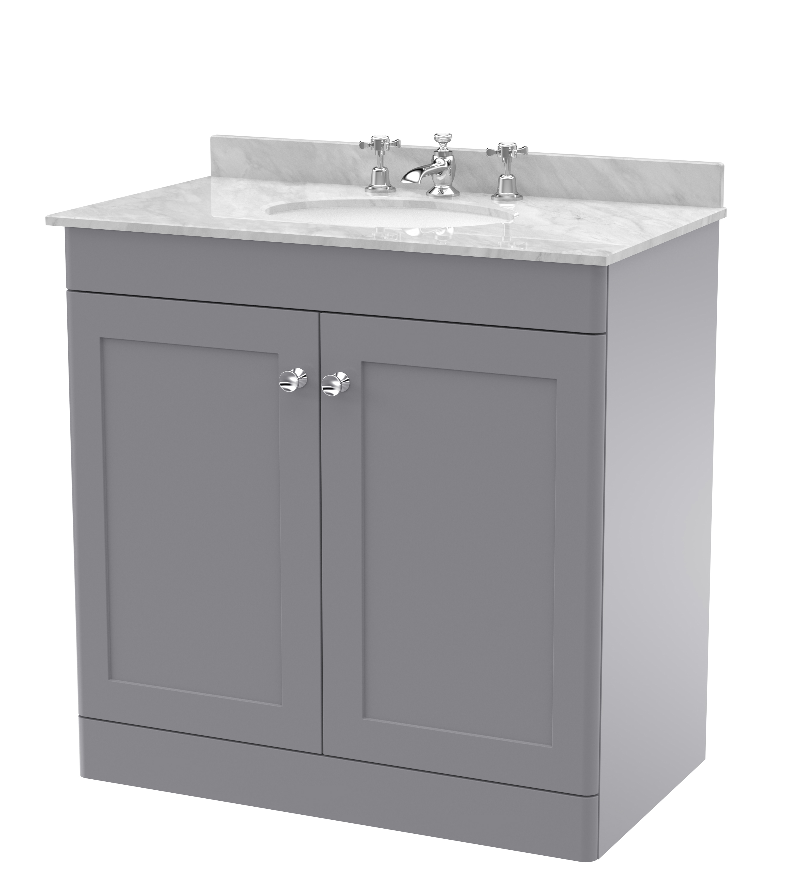 nuie Classique Floor Standing 2 Door Unit & 3 Tap Hole Marble Top with Oval Basin, 800mm - Satin Grey/Grey