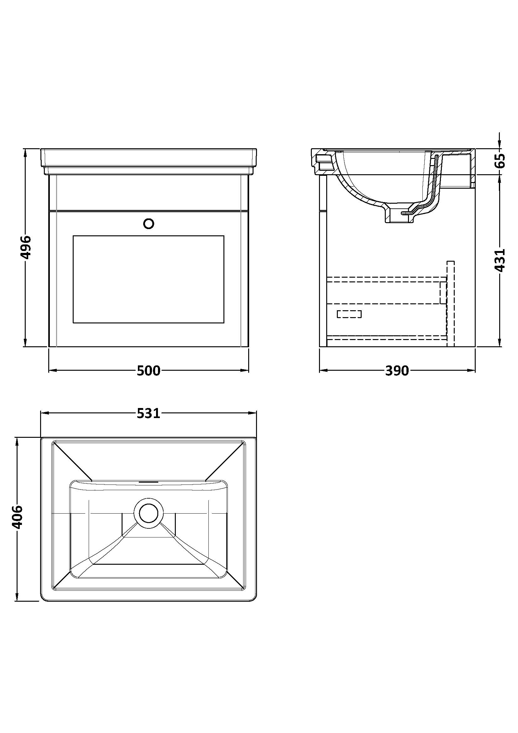 Classique Wall Hung 1 Drawer Unit & 0 Tap Hole Fireclay Basin, 500mm