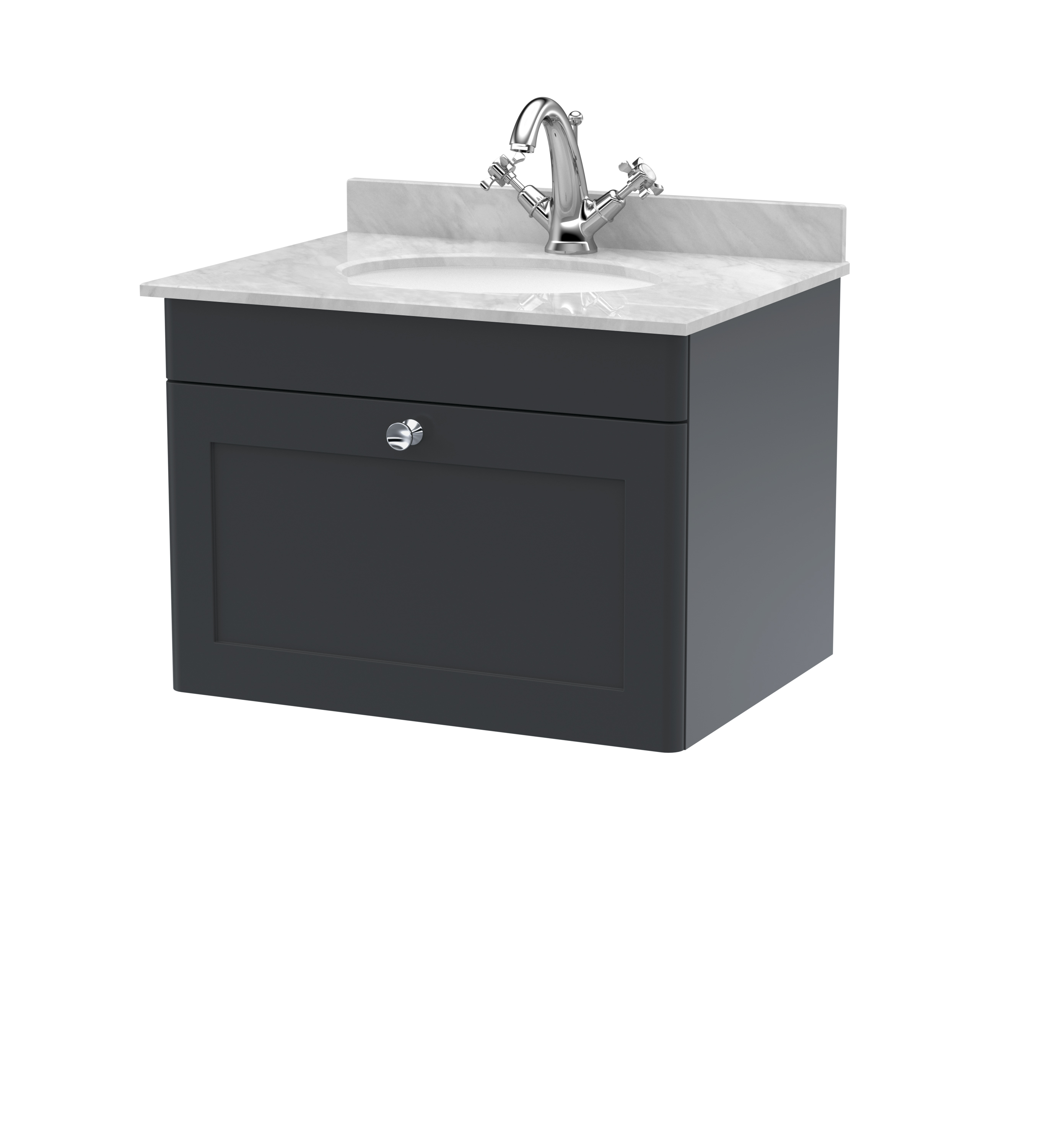 nuie Classique Wall Hung 1 Drawer Unit & 1 Tap Hole Marble Top with Oval Basin, 600mm - Satin Anthracite/Grey