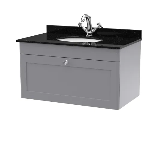 nuie Classique Wall Hung 1 Drawer Unit & 1 Tap Hole Marble Top with Oval Basin, 800mm - Satin Grey/Black