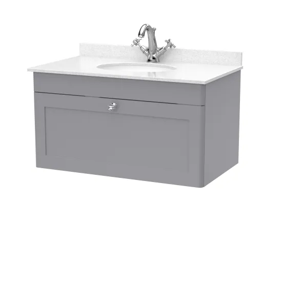 nuie Classique Wall Hung 1 Drawer Unit & 1 Tap Hole Marble Top with Oval Basin, 800mm - Satin Grey/White
