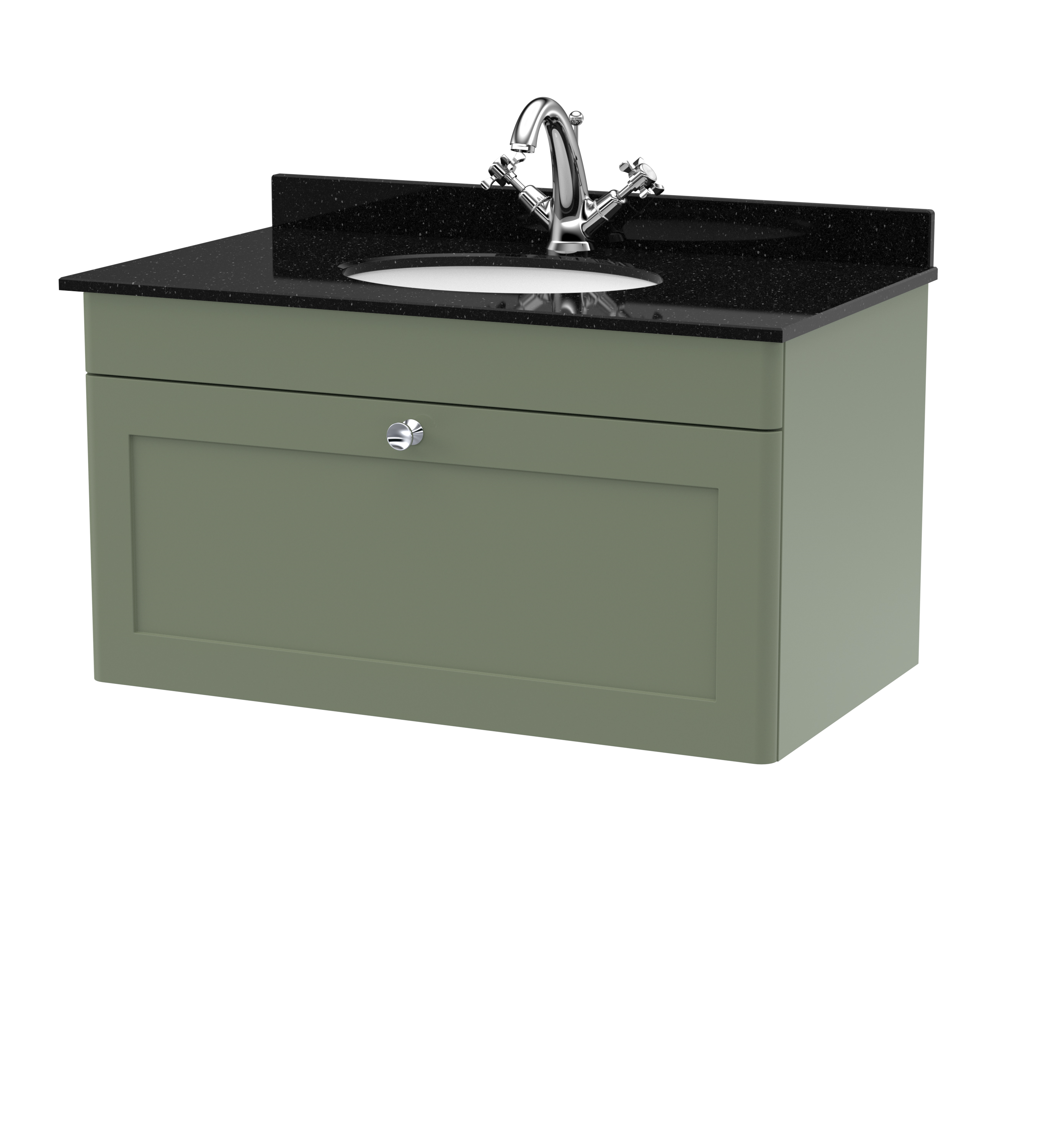 nuie Classique Wall Hung 1 Drawer Unit & 1 Tap Hole Marble Top with Oval Basin, 800mm - Satin Green/Black