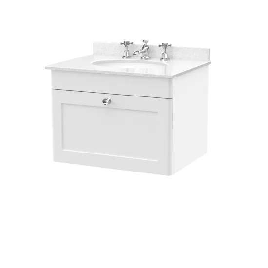 nuie Classique Wall Hung 1 Drawer Unit & 3 Tap Hole Marble Top with Oval Basin, 600mm - Satin White/White