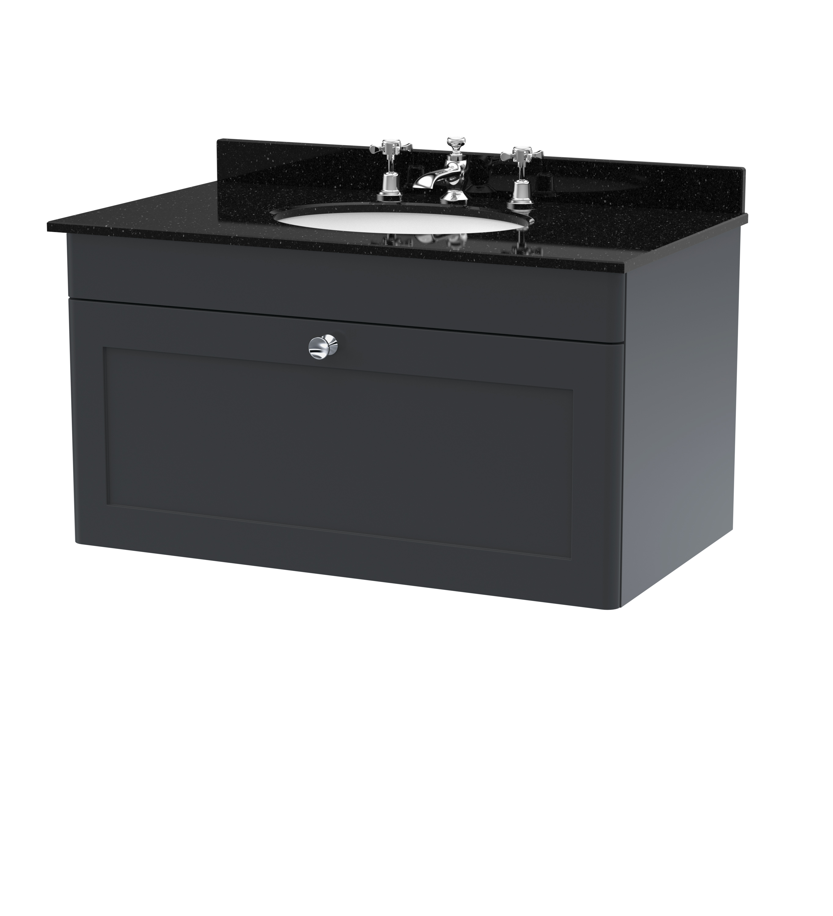 nuie Classique Wall Hung 1 Drawer Unit & 3 Tap Hole Marble Top with Oval Basin, 800mm - Satin Anthracite/Black