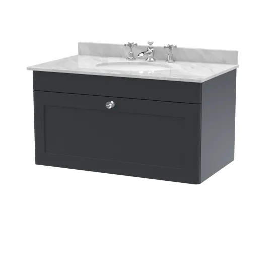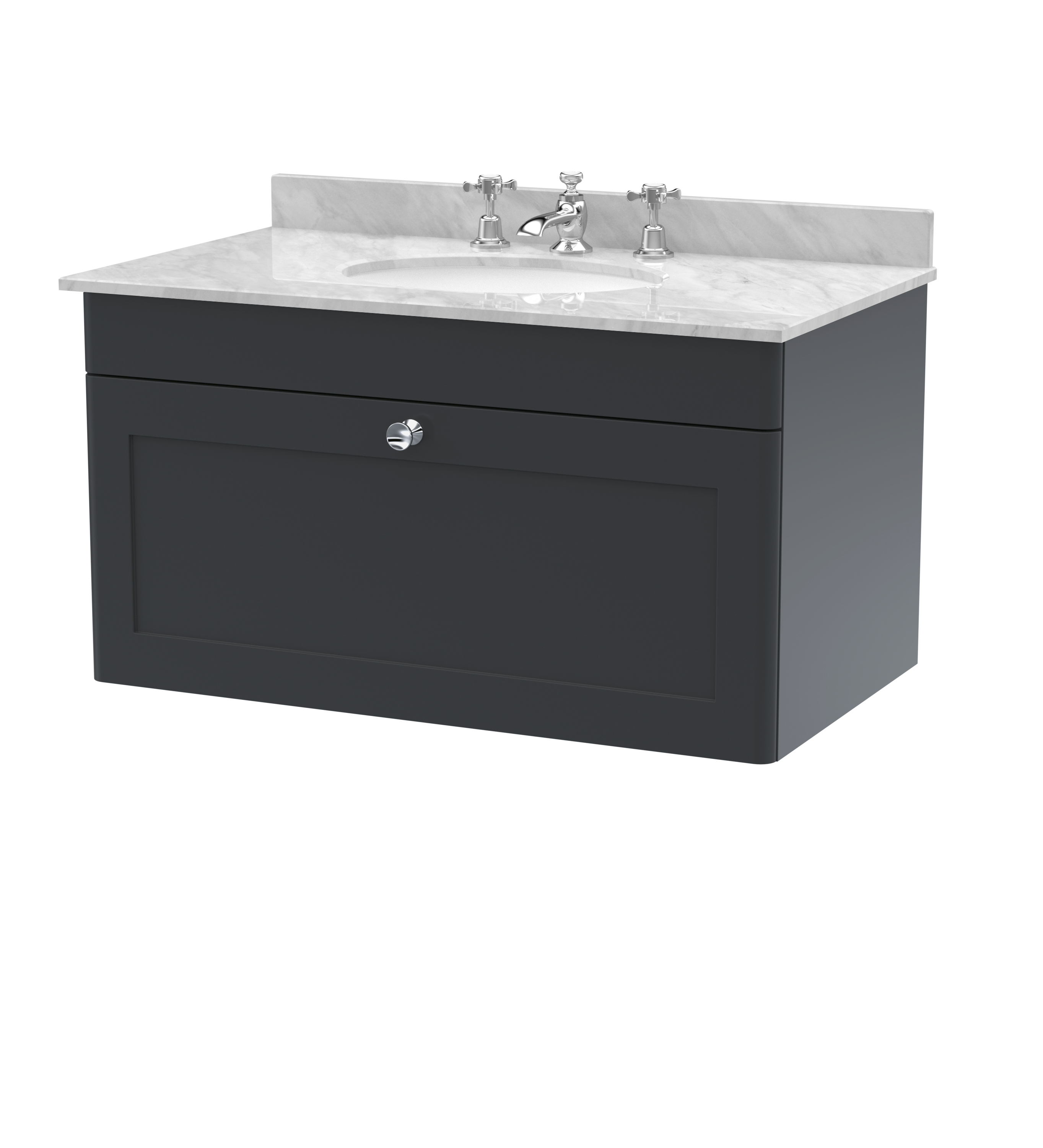 nuie Classique Wall Hung 1 Drawer Unit & 3 Tap Hole Marble Top with Oval Basin, 800mm - Satin Anthracite/Grey