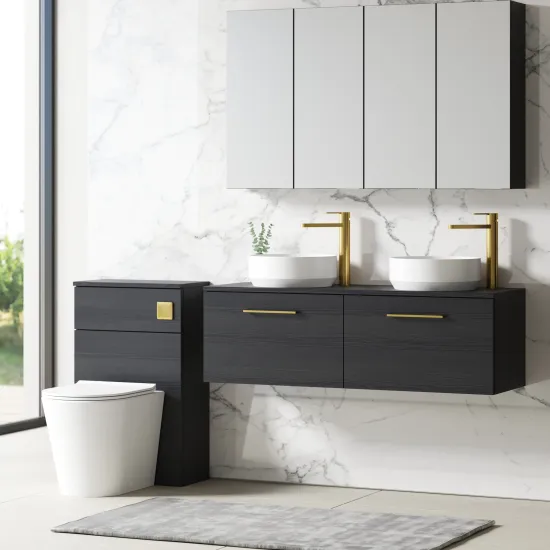 This unique charcoal black finish compliments any modern bathroom to create a designer look. This wall hung unit creates more space in your bathroom giving the illusion of a bigger bathroom. This unit has soft close drawers which limits the daily wear and tear and provides a quieter closing action. Colour co-ordinate your unit with a charcoal black WC unit. Supplied with worktop..