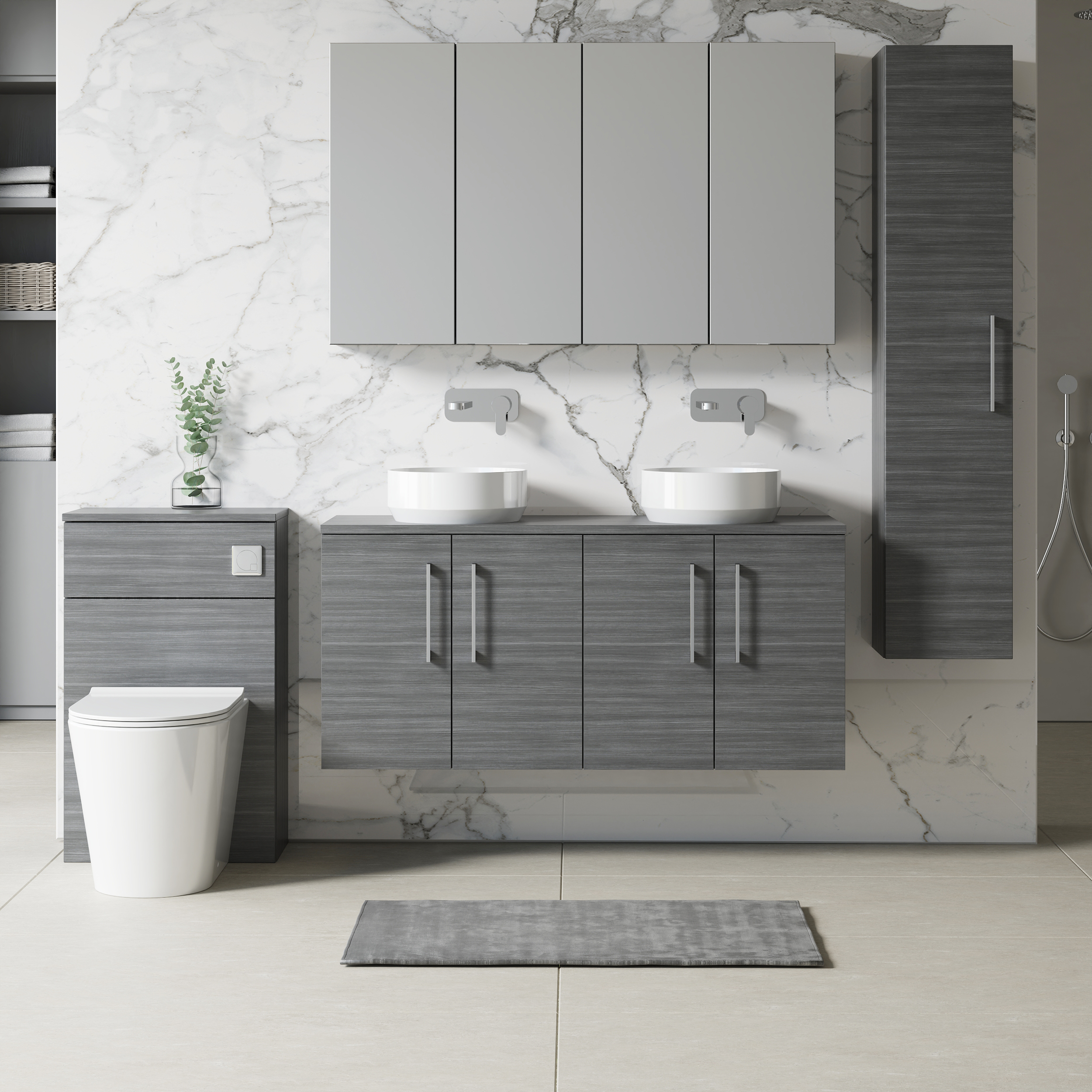 This unique anthracite finish compliments any modern bathroom to create a designer look. This wall hung unit creates more space in your bathroom giving the illusion of a bigger bathroom. This unit has soft close doors which limits the daily wear and tear and provides a quieter closing action. Colour co-ordinate your unit with an anthracite WC unit. Supplied with worktop..