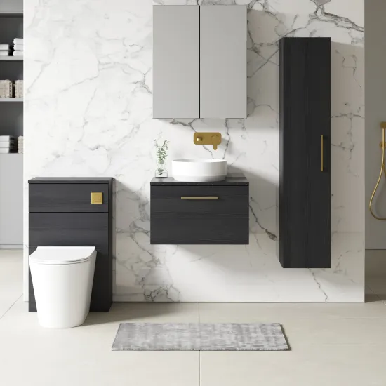 This unique charcoal black finish compliments any modern bathroom and creates a designer look. This wall hung unit creates more space in your bathroom giving the illusion of a bigger bathroom. This unit has a soft close drawer which limits the daily wear and tear and provides a quieter closing action. Colour co-ordinate your unit with a charcoal black WC unit. Supplied with laminate worktop, for use with vessel basins (sold separately).