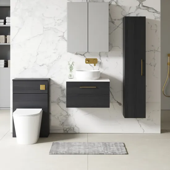 This unique charcoal black finish compliments any modern bathroom and creates a designer look. This wall hung unit creates more space in your bathroom giving the illusion of a bigger bathroom. This unit has a soft close drawer which limits the daily wear and tear and provides a quieter closing action. Colour co-ordinate your unit with a charcoal black WC unit. Supplied with laminate worktop, for use with vessel basins (sold separately).