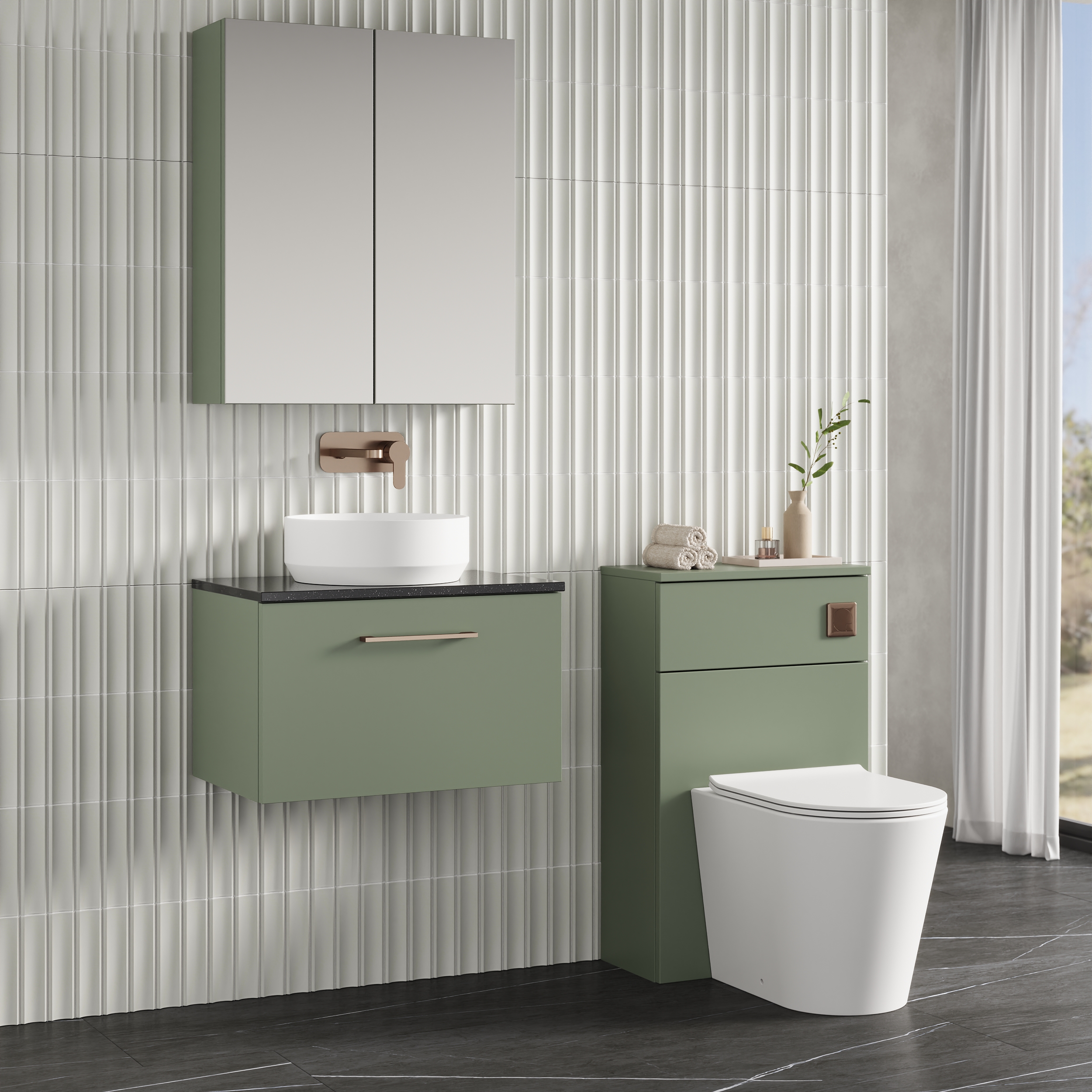 This unique green finish compliments any modern bathroom and creates a designer look. This wall hung unit creates more space in your bathroom giving the illusion of a bigger bathroom. This unit has a soft close drawer which limits the daily wear and tear and provides a quieter closing action. Colour co-ordinate your unit with a green WC unit. Supplied with laminate worktop, for use with vessel basins (sold separately).