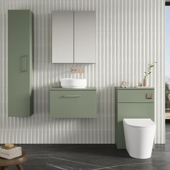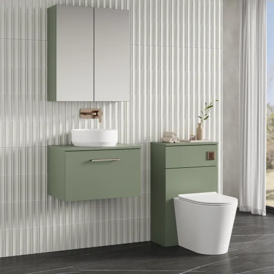 This unique green finish compliments any modern bathroom and creates a designer look. This wall hung unit creates more space in your bathroom giving the illusion of a bigger bathroom. This unit has a soft close drawer which limits the daily wear and tear and provides a quieter closing action. Colour co-ordinate your unit with a green WC unit. Supplied with worktop.